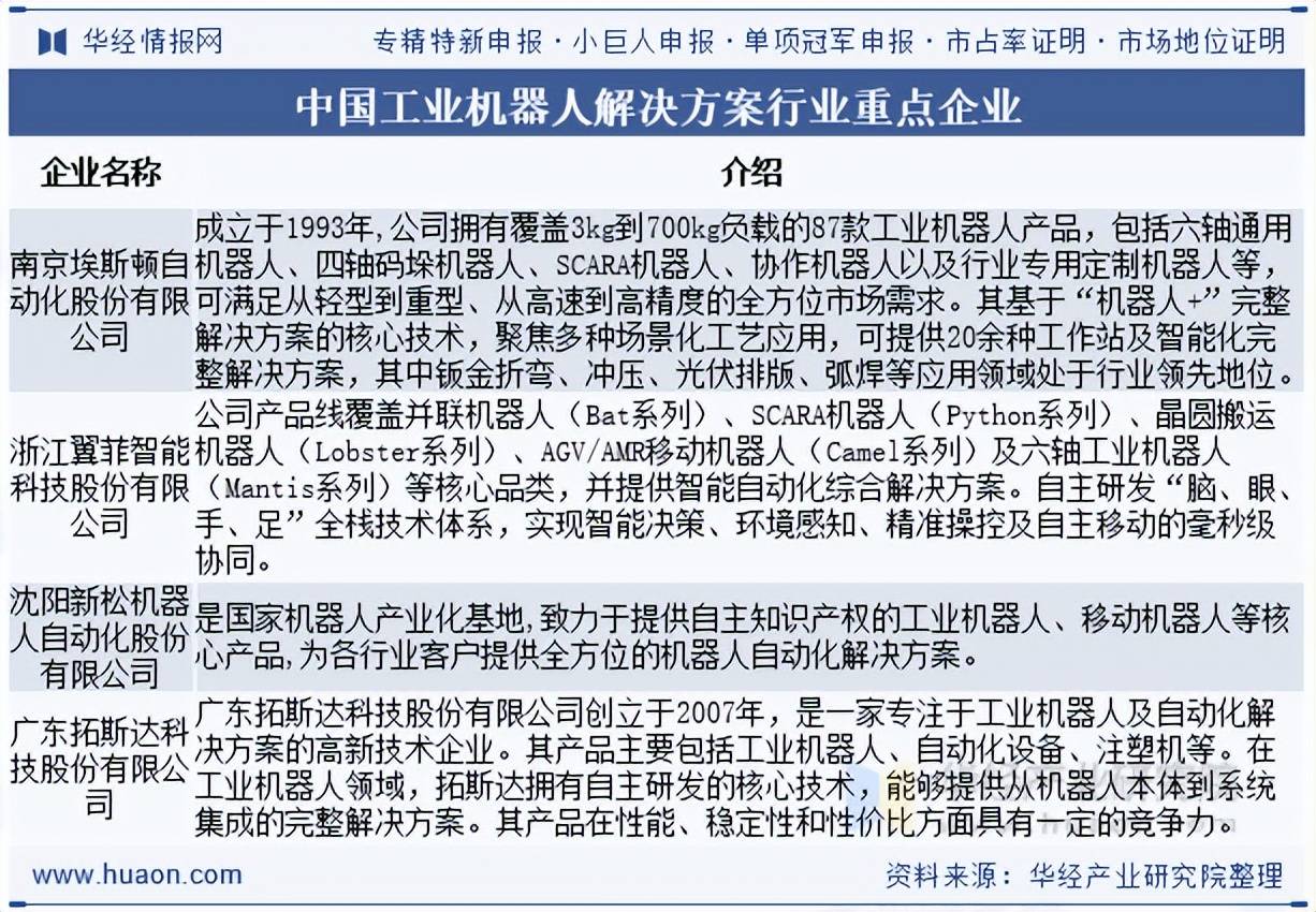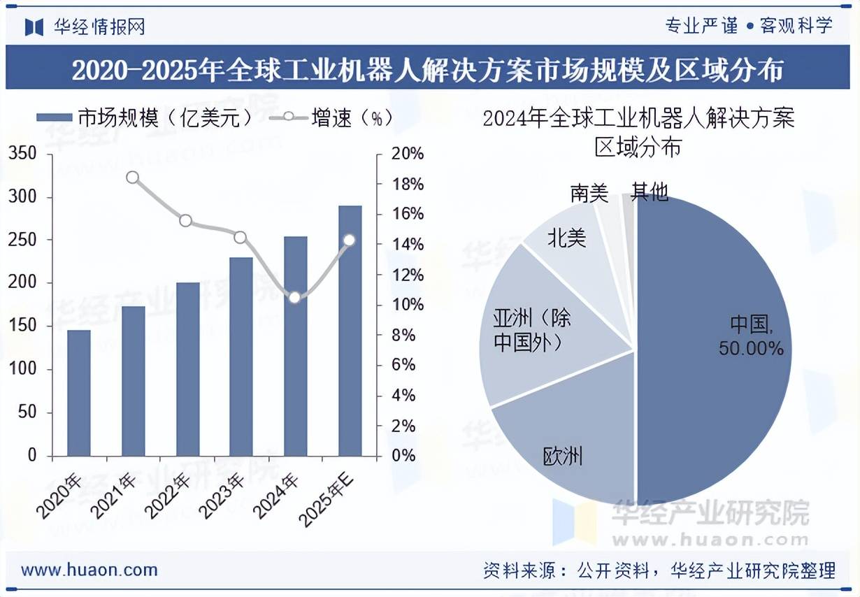 本文节选自华经财产研究院发布的《2025年中国工业机械人处理方案行业市场规模、成长布景、沉点企业及成长趋向阐发「图」》,期间年复合增加率达到14.6%。跟着科技的飞速成长和使用范畴的不竭拓展,将机械人、周边安拆及智能节制手艺无缝集成,为分歧业业量身打制高效、精准的定制化系统,2024年中国工业机械人处理方案市场规模占全球总规模比沉的50%,中国工业机械人处理方案市场从2020年的69亿美元增至2024年的127亿美元,近年来,中国的工业机械人处理方案市场将于2025年达到149亿美元。受制制流程从动化需求添加、劳工成本上升以及手艺前进的鞭策,代表企业有南京埃斯顿从动化股份无限公司、浙江翼菲智能科技股份无限公司、沈阳新松机械人从动化股份无限公司、广东拓斯达科技股份无限公司等。全面客不雅的分解工业机械人处理方案行业成长的总体市场容量、财产链、运营特征、盈利能力和贸易模式等。跟着越来越多的行业分析机械人处理方案以提高效率、切确度和出产力,估计到2025年市场规模无望达到290亿美元。